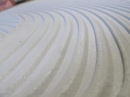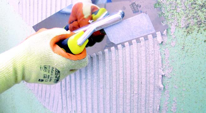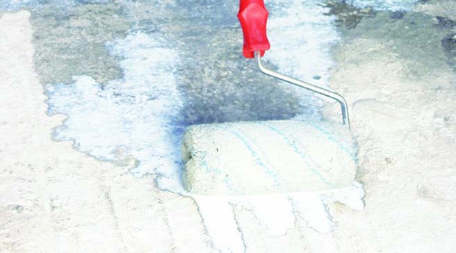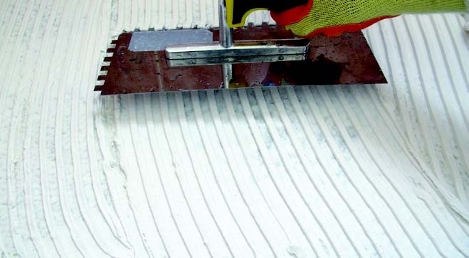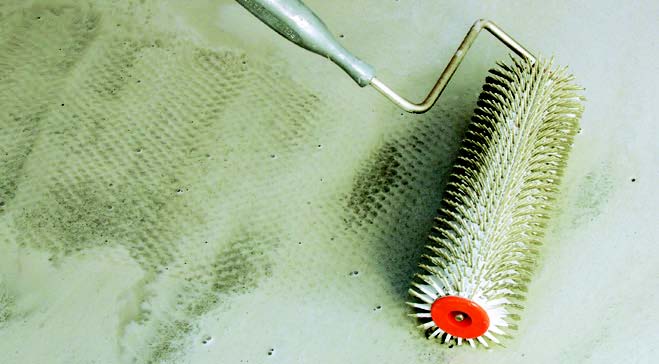 Το ακιδωτό ρολό βοηθάει στο να απομακρυνθούν οι φυσαλίδες που ίσως δημιουργηθούν κατά την εφαρμογή του αυτοεπιπεδούμενου δαπέδου. κατόπιν, το δάπεδο είναι έτοιμο για την εφαρμογή πλακόστρωσης. προτείνουμε την υπερελαστική κόλλα (S2) ενός συστατικού, VKW 129, η οποία είναι κατάλληλη για απαιτητικές εφαρμογές, όπως χώροι με μόνιμη υγρασία και έντονες συστολοδιαστολές (ενδοδαπέδια θέρμανση).
