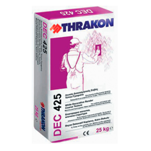 DEC 425 е суха благородна фасадна мазилка на циментова основа за декоративно оформление на фасади. Полага се върху бетон, варо-циментови мазилки, шпакловки и всякакъв вид други минерални основи. За вътрешна и външна употреба, водоотблъскваща и UV устойчива. Изисква предварително грундиране с Thrakon акрилен грунд.