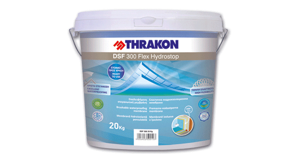 - DSF 300 Flex Hydrostop се употрeбява като безшевна и безфугова хидроизолация върху хоризонтални и вертикални повърхности преди полагане на подова керамика в бани, санитарни възли, мокри помещения, тераси и балкони. След пълното изсъхване на продукта (24 ч. след полагането) върху DSF 300 Flex Hydrostop може да се лепят директно керамични плочки с помощта на еластично циментово лепило Тhrakon.