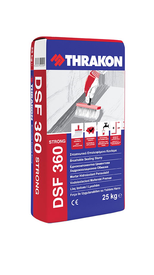 DSF 360 е полимер-модифицирана хидроизолационна обмазка на циментова основа, подходяща за употреба при положително и отрицателно водно налягане. Съдържа цимент, кварцов пясък, минерални пълнители и добавки. С отлично сцепление с минерални основи, мразо и влагоустойчива. За вътрешна и външна употреба.