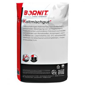 Готовa за употреба, студенополаганa битумна смес за бързи поправки и ремонт на повредени бетонови или асфалтови повърхности. За дебелина на слоя от 10 – 50 мм.