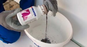The first step is to mix component B of DECOR (5kg liquid resin) with DECOR ART pigment. Then add a small amount of water in DECOR ART and stir the pigment. The next step is to pour the content of DECOR ART in the bucket containing the emulsion. Make sure to empty the entire content of DECOR ART. Stir the liquid mixture by using a low speed mixer (300 rpm/min), until we get a homogenious mixture and then add the bag with 25kg mortar, while stirring. During this