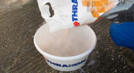 Step 2:Mix in an empty bucket clean water with the desired shade of tile grout (THRAKON FMF 150 colour chart). The amount you need depends on the needs of style and artistic mood you have.