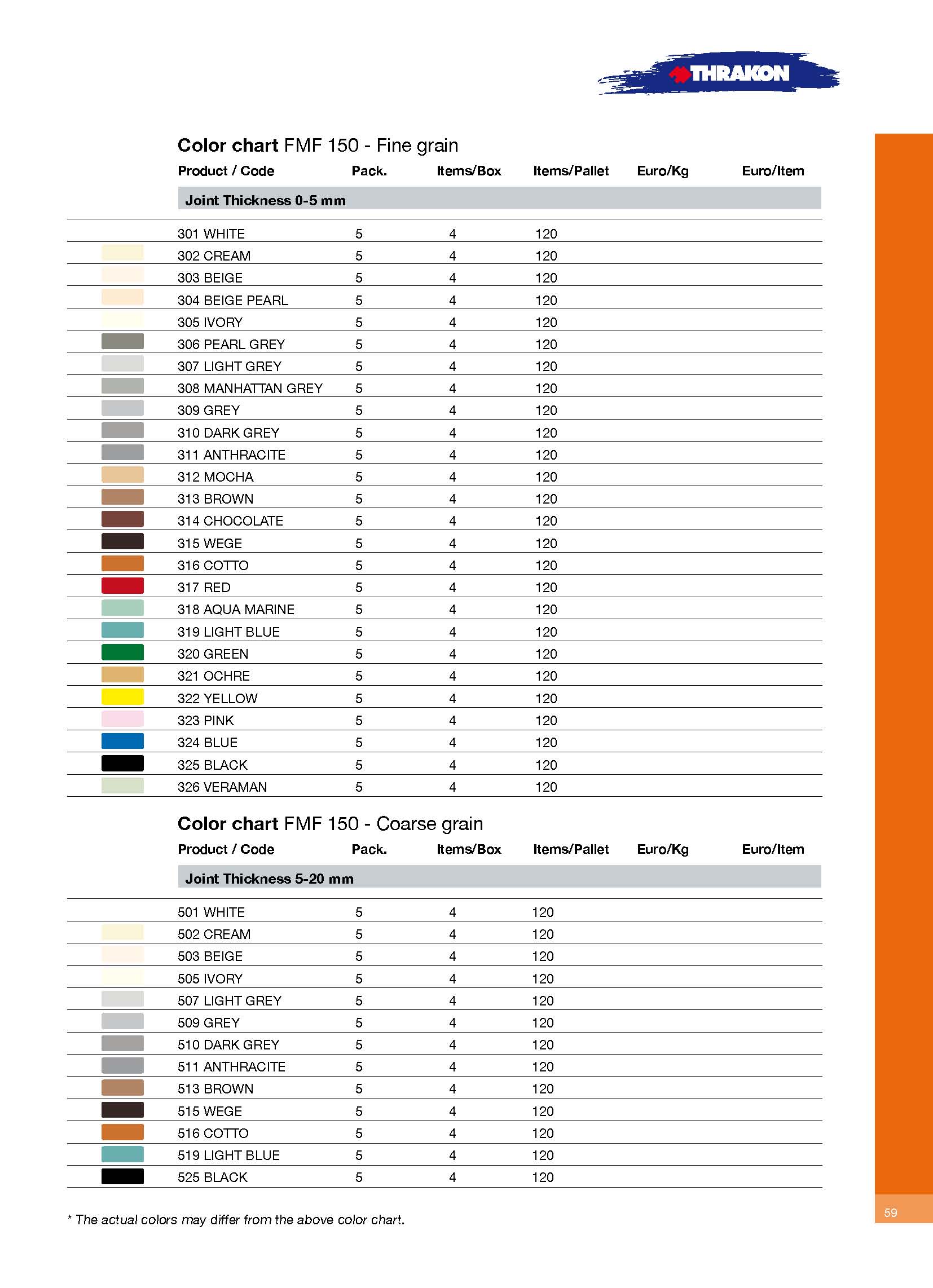 FMF 150 is a colored, polymer modified, cement-based grout for grouting tiles. It has high mechanical strengths and exhibits frost and moisture resistance. It is classified as type CG2 according to EN 13888.