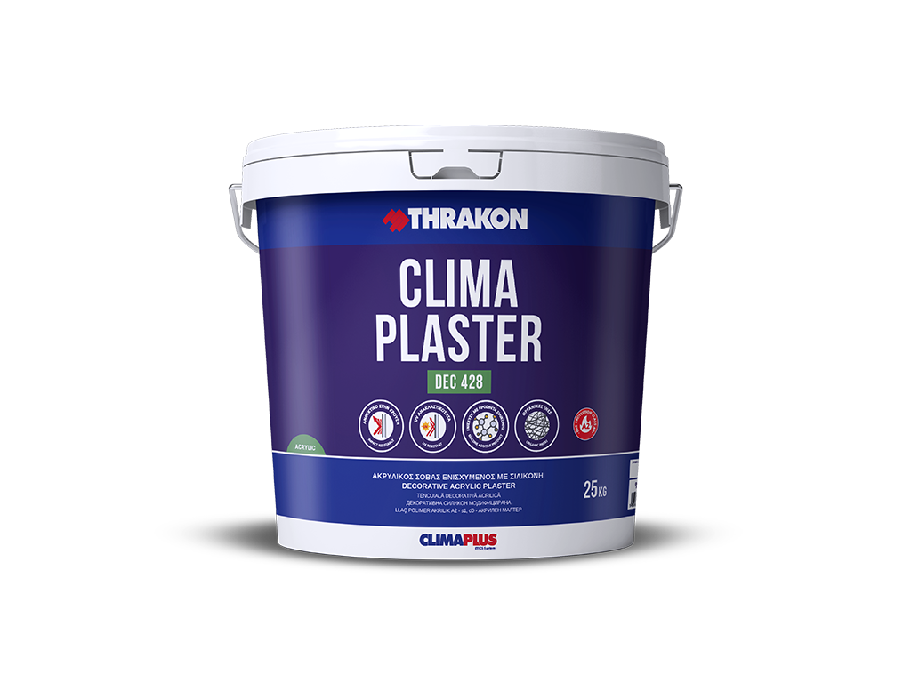 Το προϊόν CLIMA PLASTER DEC 428 είναι ένας ακρυλικός σοβάς υψηλής ποιότητας σε μορφή πάστας, με υψηλή σκληρότητα. Είναι ενισχυμένος με ρητίνες σιλικόνης και προσφέρει άριστη υδαταπωθητικότητα και εργασιμότητα, με εξαιρετικές αντοχές στην υπεριώδη ακτινοβολία (UV) και στις ατμοσφαιρικές συνθήκες. Διατίθεται σε τεχνοτροπίες SCRATCH, RILLEN και FINE.