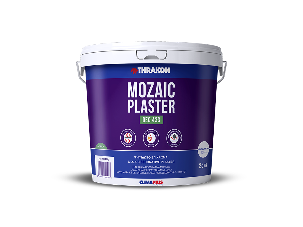 Το MOZAIC PLASTER DEC 433 αποτελεί λύση ταυτόχρονα διακοσμητική και πρακτική, με τους χρωματιστούς κόκκους μαρμάρου να διαμορφώνουν μια εντυπωσιακή όψη μωσαϊκού