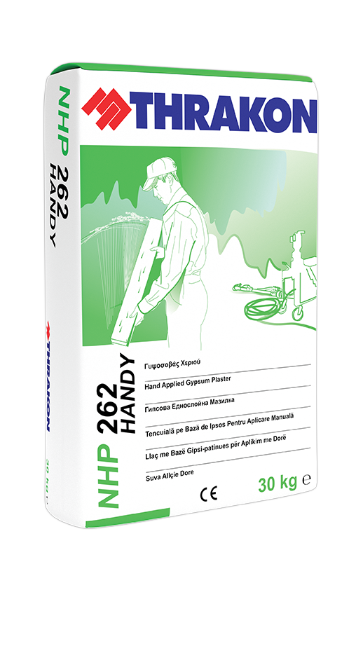 Το προϊόν NHP 262 HANDY είναι ένας έτοιμος γυψοσοβάς χεριου μιας στρώσης κατάλληλος για το σοβάτισμα εσωτερικών επιφανειών. Αποτελείται από γύψο υψηλής ποιότητας, ελαφροβαρή filler, μάρμαρο και βελτιωτικά πρόσμικτα. Με τη χρήση του γυψοσοβά αντικαθίσταται τόσον το πεταχτό και το λάσπωμα, αλλά και το τελικό σοβάτισμα με μάρμαρο. Επίσης αντικαθίσταται και το σπατουλάρισμα. Η τελική επιφάνεια του γυψοσοβά είναι κατάλληλη για βάψιμο. Έχει άριστη πρόσφυση στο υπόστρωμα, εξομαλύνει τις επιφάνειες αποδίδοντας ένα τέλειο φινίρισμα με ένα μόνο πέρασμα. Δίνει μια λευκή και ανθεκτική επιφάνεια χωρίς σκασίματα. Παράγεται και ελέγχεται με βάση το ευρωπαϊκό πρότυπο ΕΝ 13279-1.