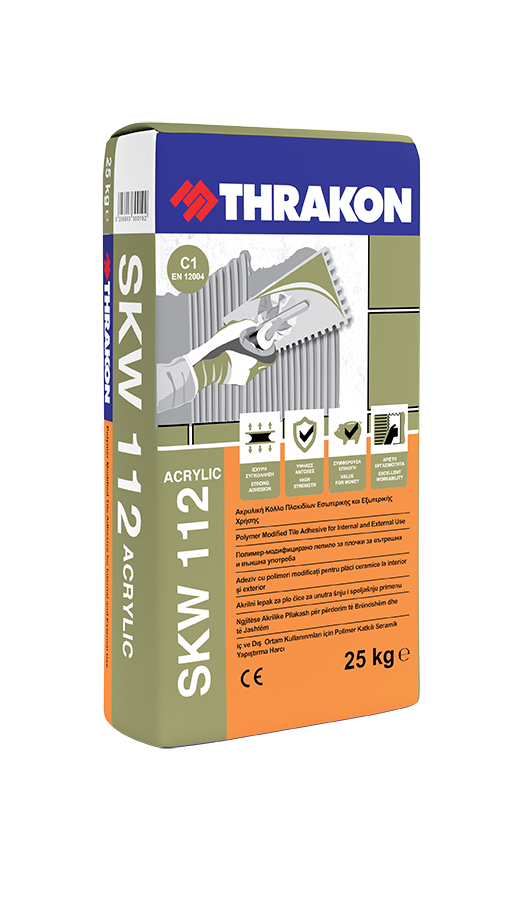 Η SKW 112 είναι μία ακρυλική κόλλα πλακιδίων λεπτής στρώσης, τσιμεντοειδούς βάσης, τροποποιημένη με πολυμερικά πρόσθετα