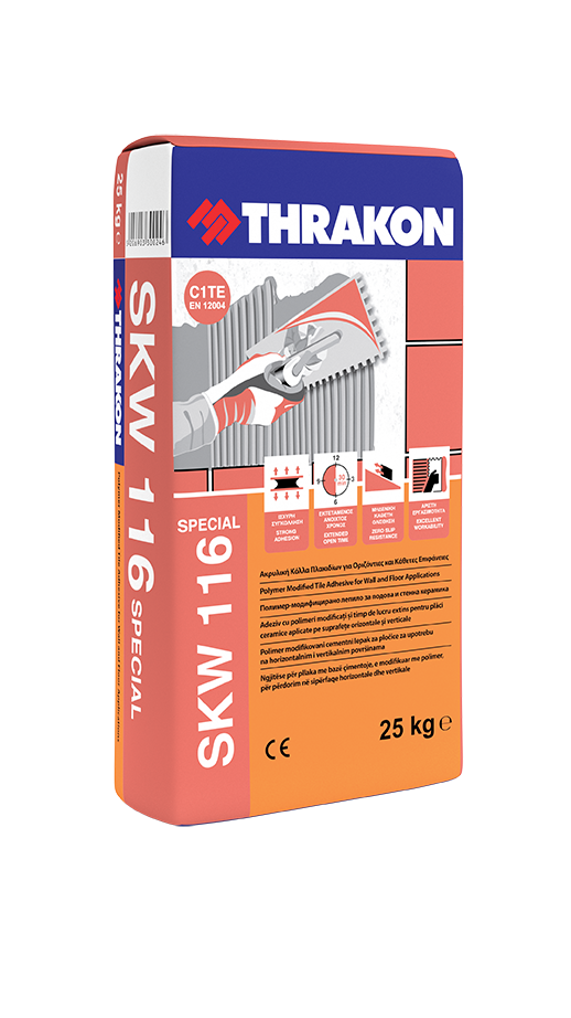 Η SKW 116 είναι μία κόλλα πλακιδίων λεπτής στρώσης, τσιμεντοειδούς βάσης, τροποποιημένη με πολυμερικά πρόσθετα για εσωτερική και εξωτερική χρήση σε οριζόντιες και κατακόρυφες επιφάνειες