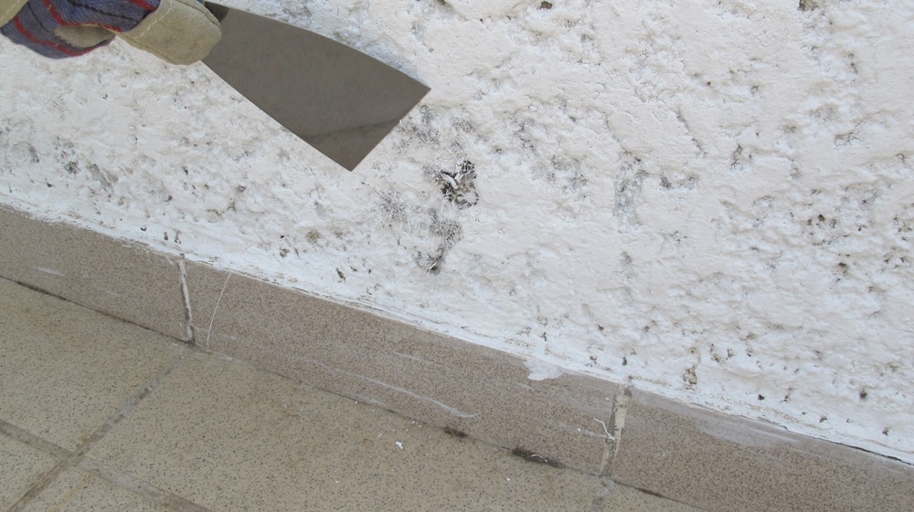 BHMA 1: Απομακρύνουμε, με μια σπάτουλα, τα σαθρά και φουσκωμένα σημεία του χρώματος, επάνω από το σοβατεπί. Καθαρίζουμε καλά την επιφάνεια από σκόνες